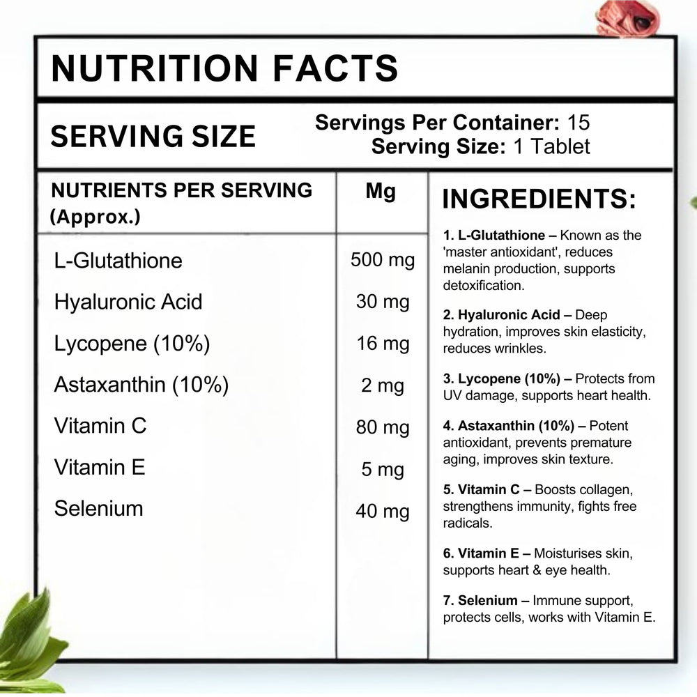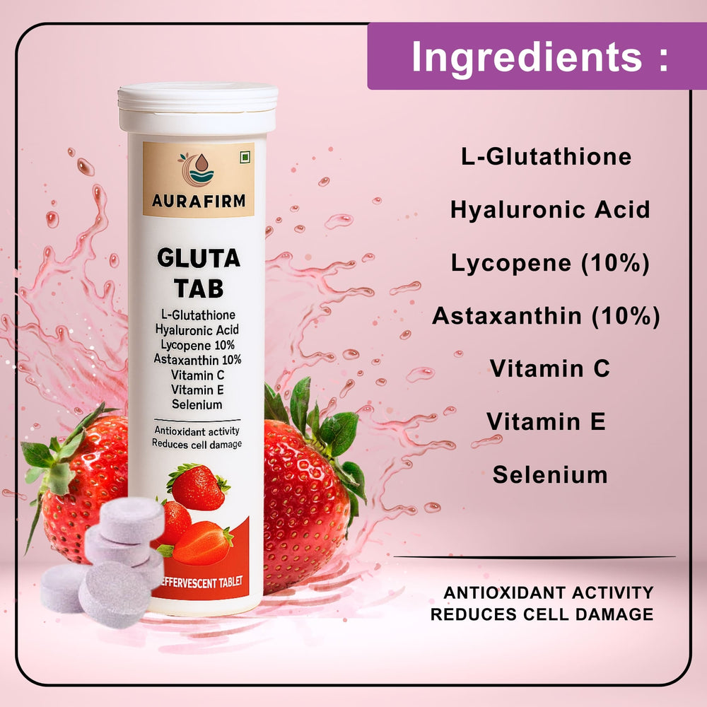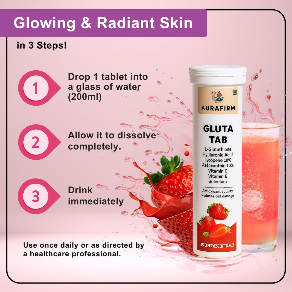 A refreshing strawberry-flavoured effervescent tablet designed to protect your skin and body from oxidative stress, reduce pigmentation, boost immunity, and promote youthful, radiant skin.
